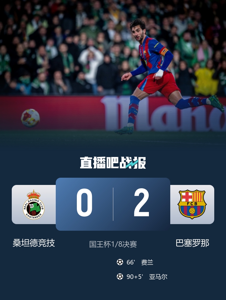 费兰·托雷斯单刀破门,亚马尔补时锁定胜局,最终巴萨2-0桑坦德竞技,晋级国王杯八强。